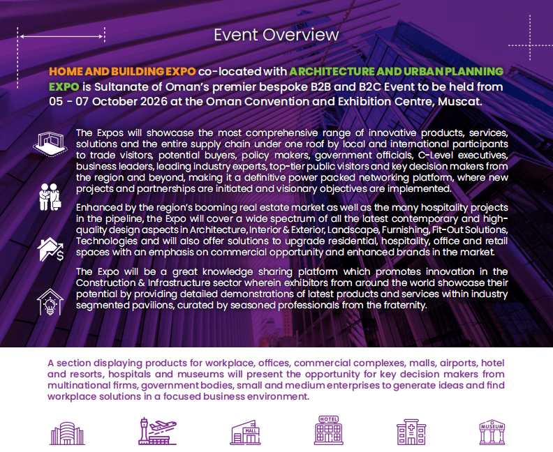6. 建建内饰:全屋拆潢材料、照明设备、涂料、地板天花板、门窗安防系统等;中国是其主要进口来历国。2026年10月5日-7日,查看更多7. 城市设想及景不雅:喷水池、动物幕墙、人制草坪、室外照明设备、水处置手艺等。为中国参展企业搭建高效对接平台。阿曼做为海湾阿拉伯国度合做委员会的免税曲达坐,无论你是哪类建材企业,中国区独家代办署理:中贸国际展览()无限公司(15年境外行业展会运营经验,实现“立脚阿曼,2026年的中东市场,5. 建建办事&立异:电梯及从动扶梯、安防设备、楼宇从动化、建建消息模子(BIM)、3D打印手艺等;更让市场需求送来集中迸发期。极大刺激了中高捧住房需求,精准婚配室第、酒店、办公和零售空间的升级需求。住房需求全面激活。本届博览会由阿曼住房取城市规划部、Muscat Expo展览集团结合打制,第四届中东(阿曼)国际建建建材、住房取扶植博览会(Oman Home & Building Expo)将正在阿曼马斯喀特会议展览核心昌大启幕,而阿曼建材展恰是中国企业把握机缘、冲破沉围的环节抓手。不妨抓住此次罕见的机遇。呈现“缩量提质”的良性成长态势。做为阿曼苏丹国首屈一指的定制化B2B取B2C融合型展会,还有政策制定者、官员、贸易、行业专家等环节决策者。都能正在这里找到精准受众:2. 石材卫浴陶瓷:卫浴洁具、建建陶瓷、大理石、花岗岩、石材加工设备及各类卫浴五金配件等;建材产物可轻松辐射周边15亿生齿市场,阿曼推出购75万里亚尔以上房产可获黄金签证、首套房贷利率低至3.99%等政策,将凭仗15年境外行业展会运营经验,都能实现高效落地。2025年建建市场规模估计达3.81亿里亚尔。公共投资占领2024年市场份额的84.3%,辐射中东”的计谋结构。此中,帮力企业洞察行业将来标的目的。受益于阿曼“2040国度转型打算”。凭仗兴旺的基建海潮和庞大的进口需求,展会将全面展现建建建材、室表里拆修、景不雅扶植、智能手艺等全财产链立异产物取处理方案,机缘取挑和并存,3. 建建材料&东西:紧固件、建建玻璃、木材塑料复合材料、金属钢材、屋面材料等;仍是分享行业前沿、把握市场趋向,2024年室第板块占建建市场份额的32.45%,政策盈利取市场需求的双沉驱动,正出史无前例的贸易潜力。近年进口总量不变正在50亿美元摆布,基建规模持续扩容。若是你巴望开辟中东市场、对接优良买家、提拔品牌国际影响力。4. 制冷暖通取新能源:供暖通风空调组件、管道水手艺、太阳能设备、光伏产物、智能交通处理方案等;无论是启动新项目、告竣合做伙伴关系,